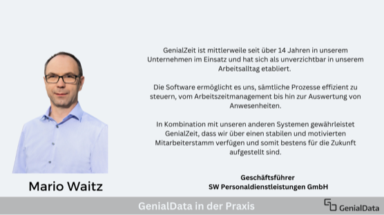 „GenialZeit ist ein äußerst zuverlässiges Tool um die vielen Aufgaben, Vorgaben, Bestimmungen und Tagesaufgaben eines Zeitarbeitsunternehmens genial und übersichtlich zu verwalten. Wir beherrschen die Überlassungsfristen, die Durchschnittsberechnung, natürlich auch alle wichtigen Verwaltungsthemen (Mitarbeiter, Kunden, Auftrag, Zeiterfassung).